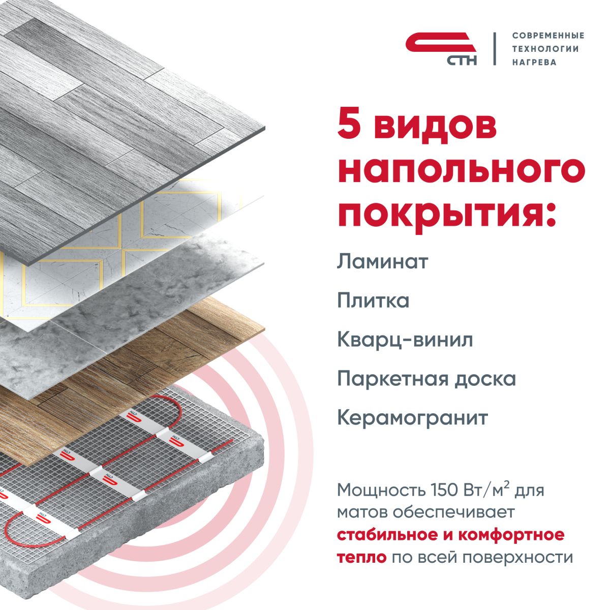 Нагревательные маты СТН не требуют обязательной установки в бетонную стяжку, возможна укладка непосредственно в плиточный клей. Используются в случаях, когда необходимо минимизировать высоту поднятия уровня пола.